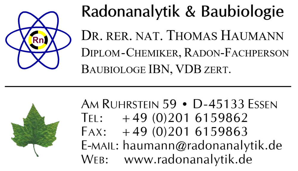 Kontakt Dr. Thomas Haumann Am Ruhrstein 59 D-45133 Essen Germany   Tel:  +49 201 615 9862   Fax: +49 201 615 9863 E-Mail: haumann@radonanalytik.de Web: www.radonanalytik.de